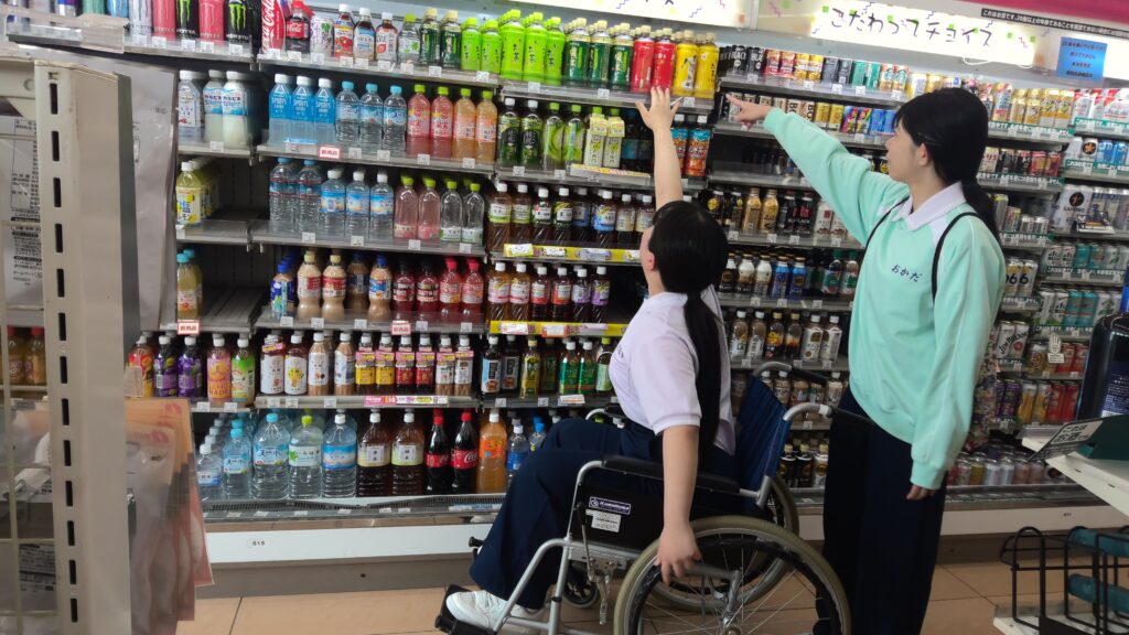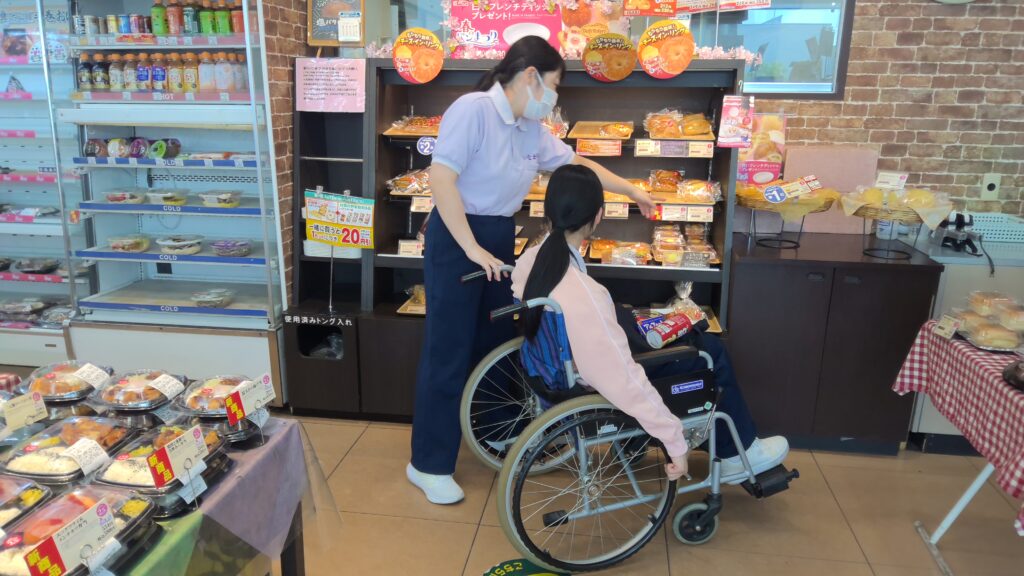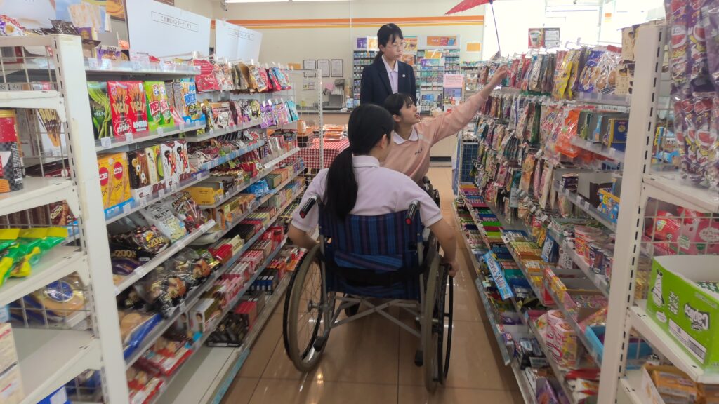 車いすで散歩をし、近くのコンビニに協力していただき、車いすの買物体験をしました。