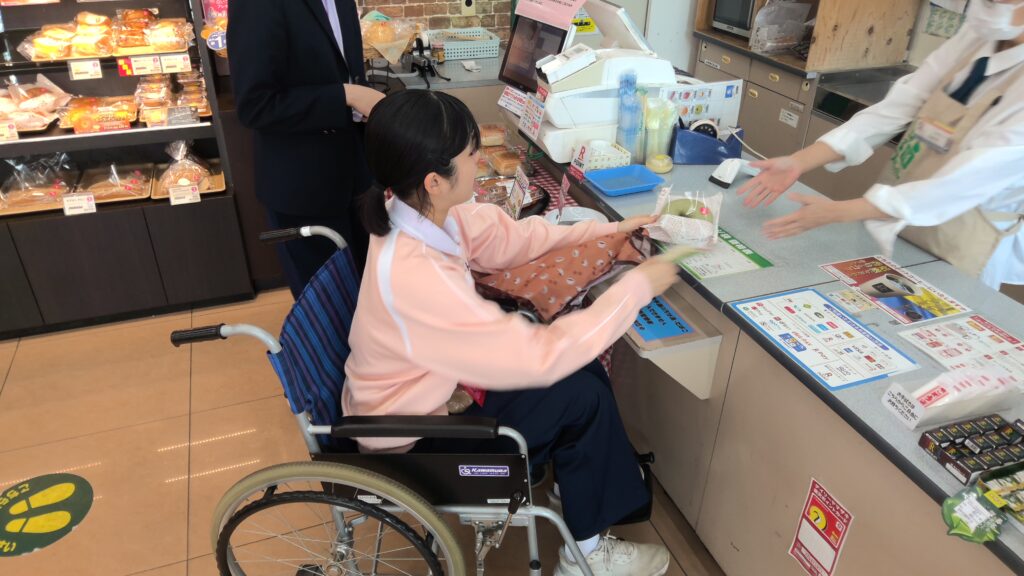 お金の支払いや品物の受け渡しも、車いすでやってみました。