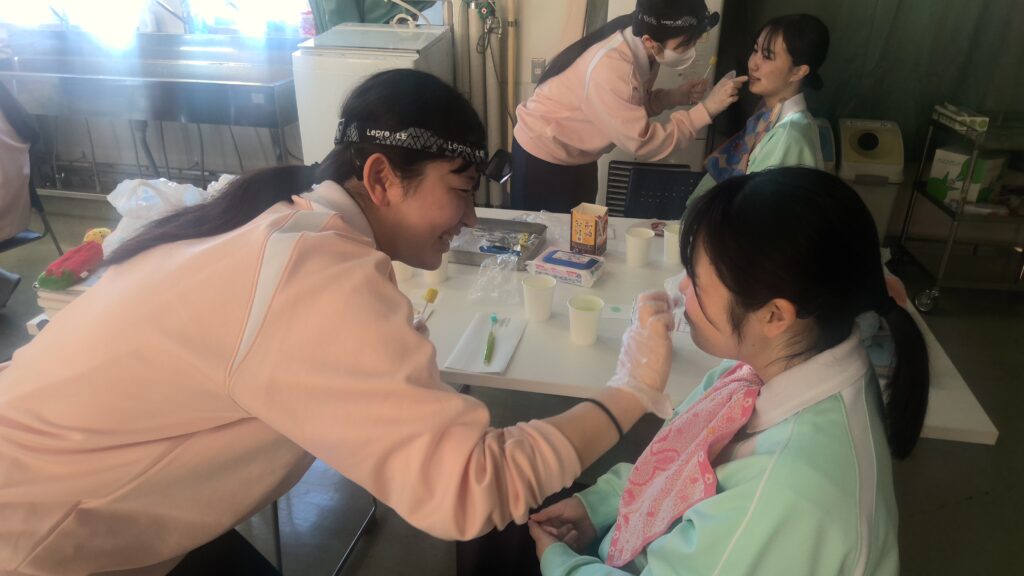 デモンストレーションのあとは、実際にクラスメイト同士で歯ブラシやスポンジブラシによる口腔ケアを実施しました。