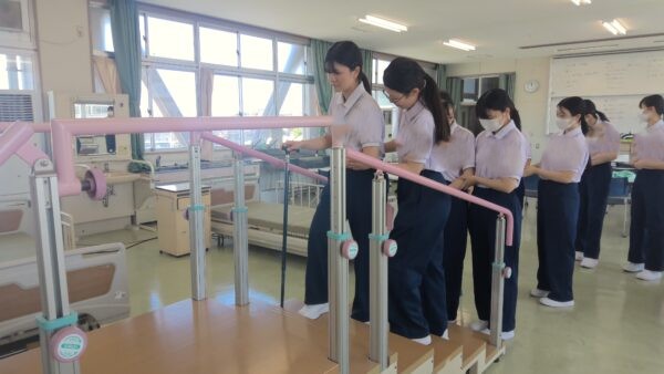 先日、2年生の生徒は授業内で杖歩行の実習をおこないました。