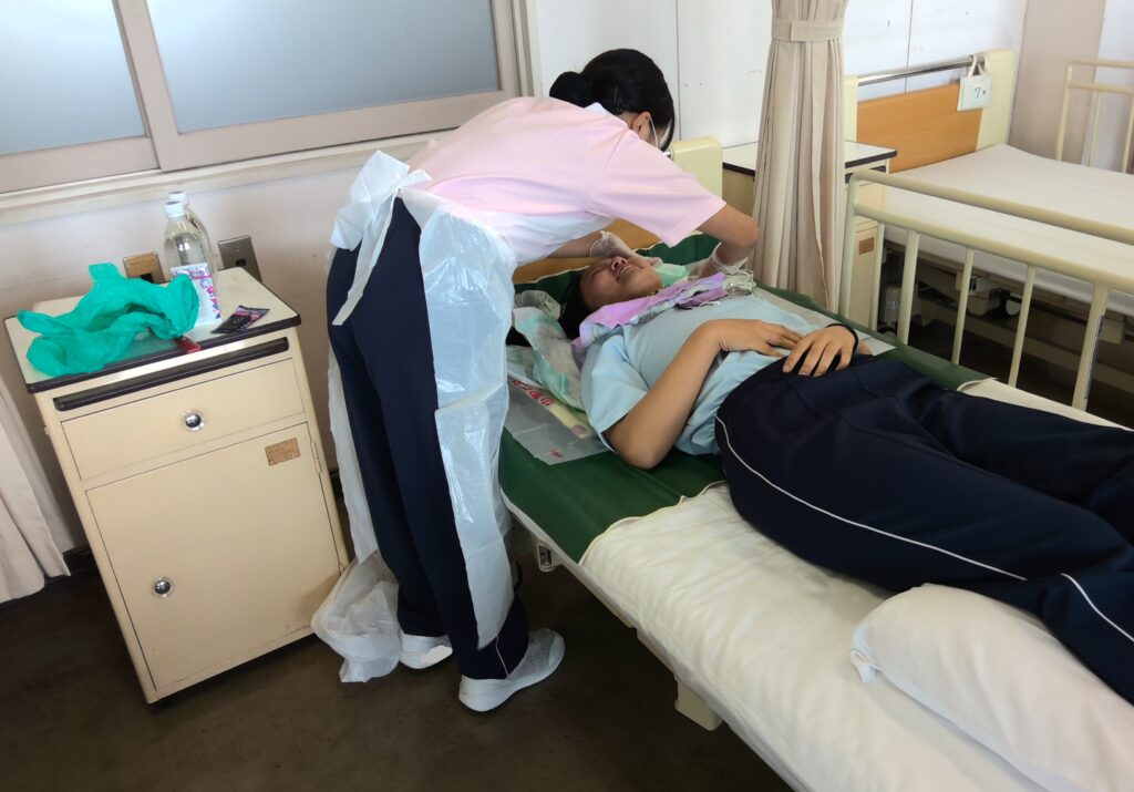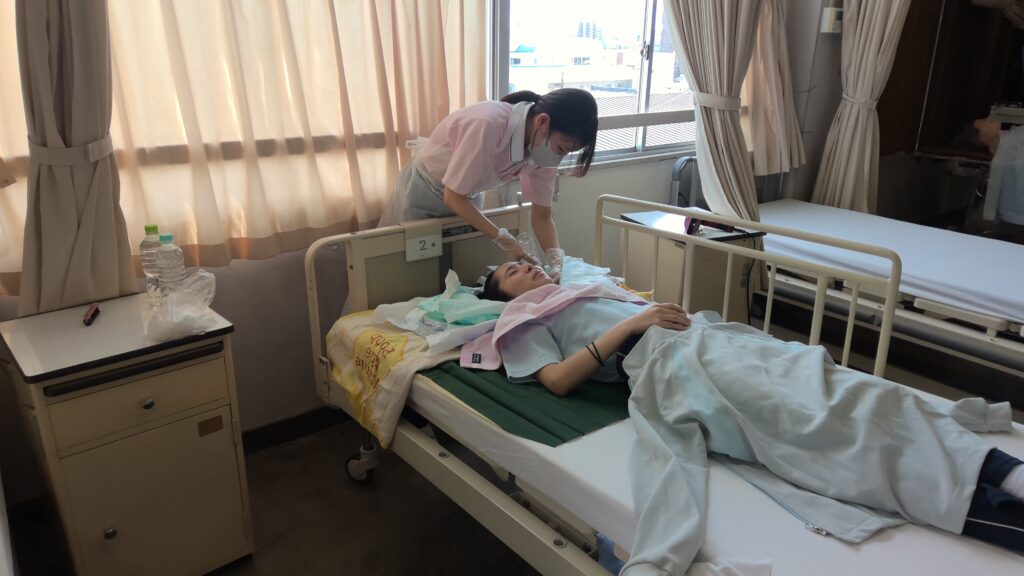 専攻科1年生が在宅看護援助論の授業で洗髪を行いました。在宅にあるタオルやビニール袋、ペットボトルに入れた湯などを活用し、各自工夫しながら行いました。