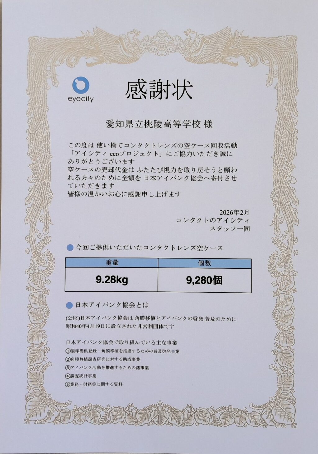 PTAのSDGs活動の一環として、「アイシティecoプロジェクト」のコンタクトレンズ空ケース回収に参加しています。このプロジェクトは、視力を取り戻そうと願われる方々を支援するための活動です。今回は、9.28kg、9,280個の空ケースを回収することができました。